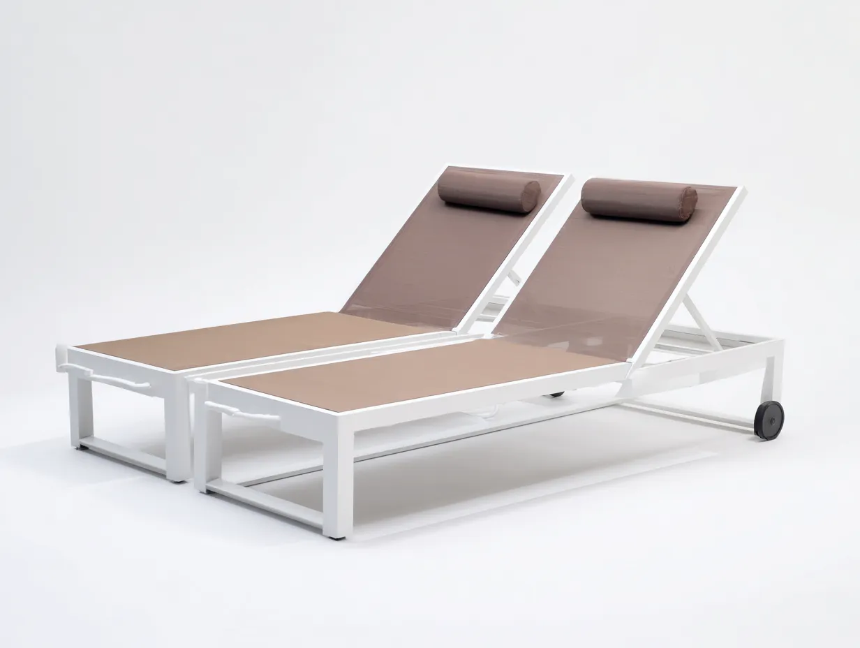 Structure en aluminium blanc résistante à la corrosion et aux intempéries. Surface en textilène marron respirant assurant un excellent confort même en plein soleil. Appuis-tête intégrés pour un soutien optimal.