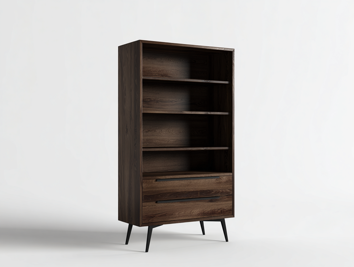 Bibliothèque en bois finition noyer avec étagères ouvertes et tiroirs - 80x38x165 cm - bois foncé - style moderne pour salon