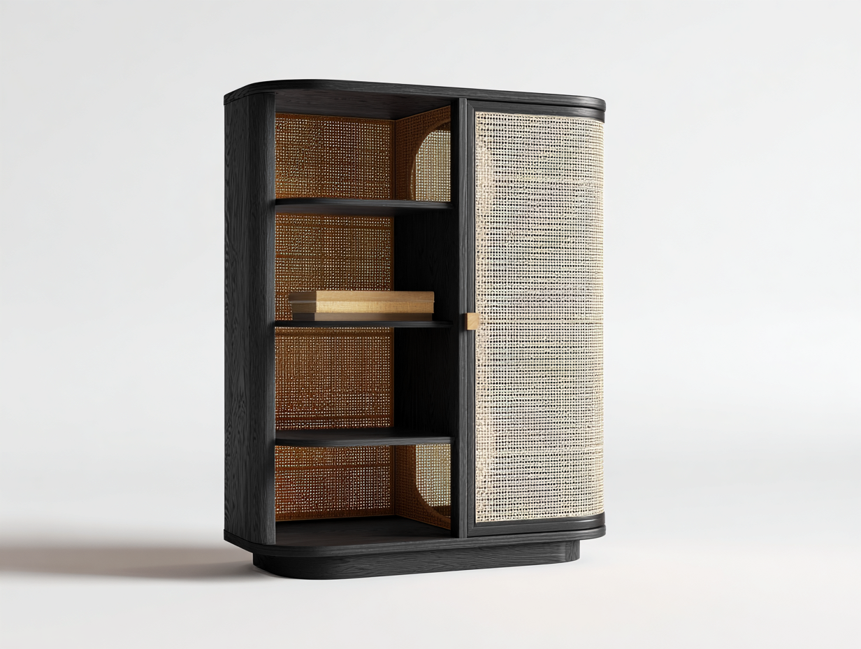 Bibliothèque avec porte coulissante - bois noir et cannage - 90x40x120 cm - noir/naturel - style contemporain