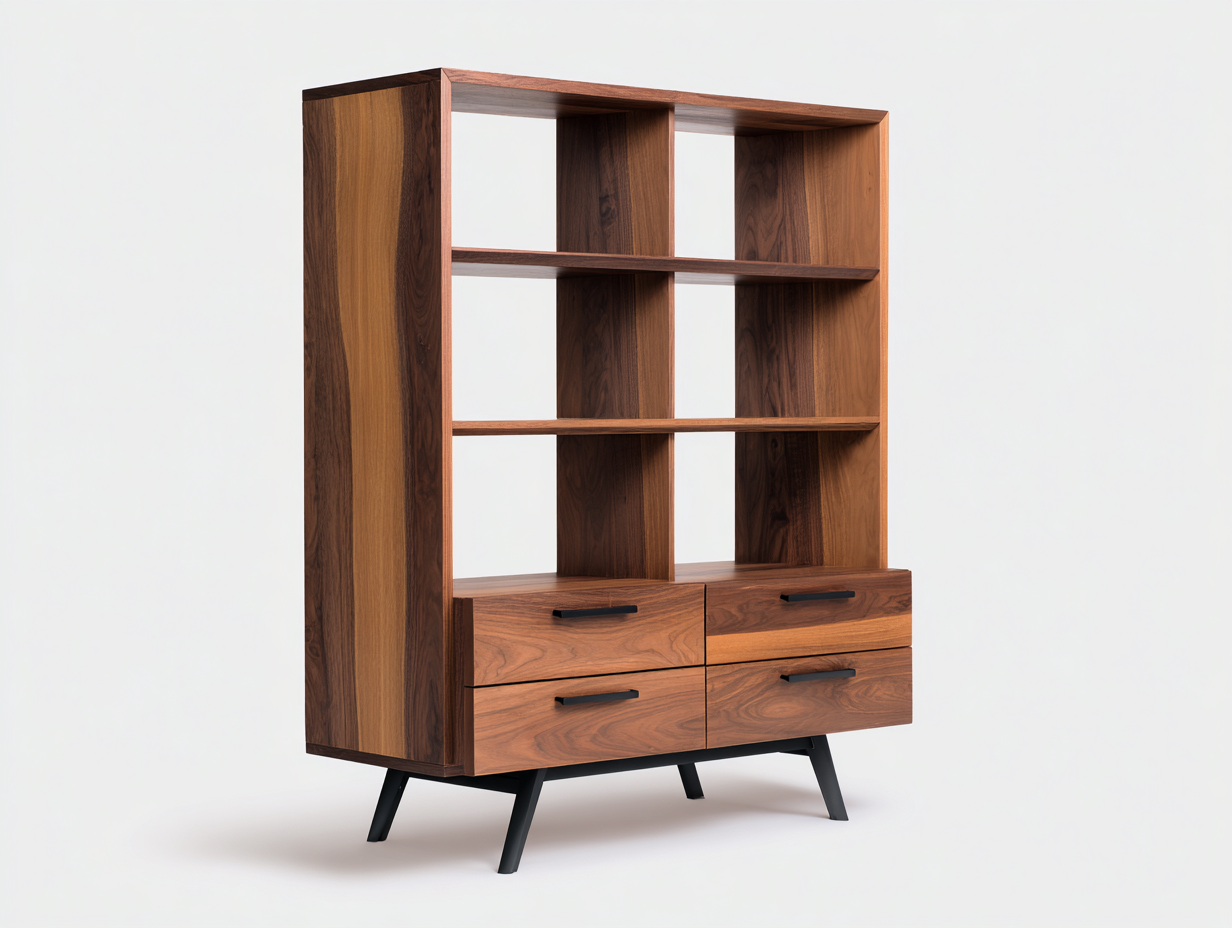 Bibliothèque en bois finition noyer avec étagères ouvertes et tiroirs intégrés, parfaite pour organiser livres et objets décoratifs dans un salon moderne. Son design chaleureux apporte une touche élégante et naturelle à votre intérieur.