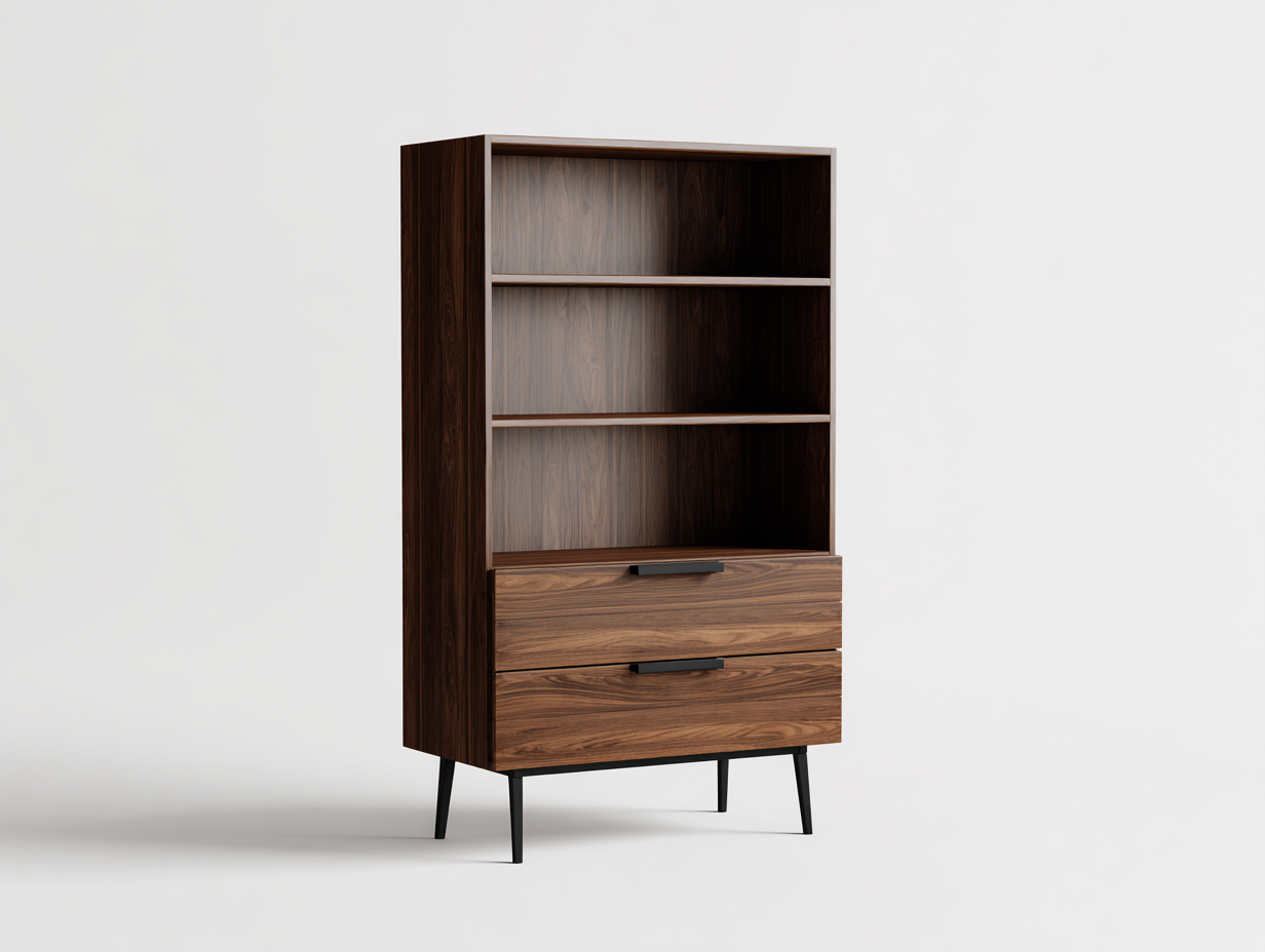 Bibliothèque en bois finition noyer avec étagères ouvertes et deux tiroirs intégrés, idéale pour organiser livres et objets décoratifs dans un salon moderne. Son design sobre et chaleureux apporte une touche élégante à votre intérieur.
