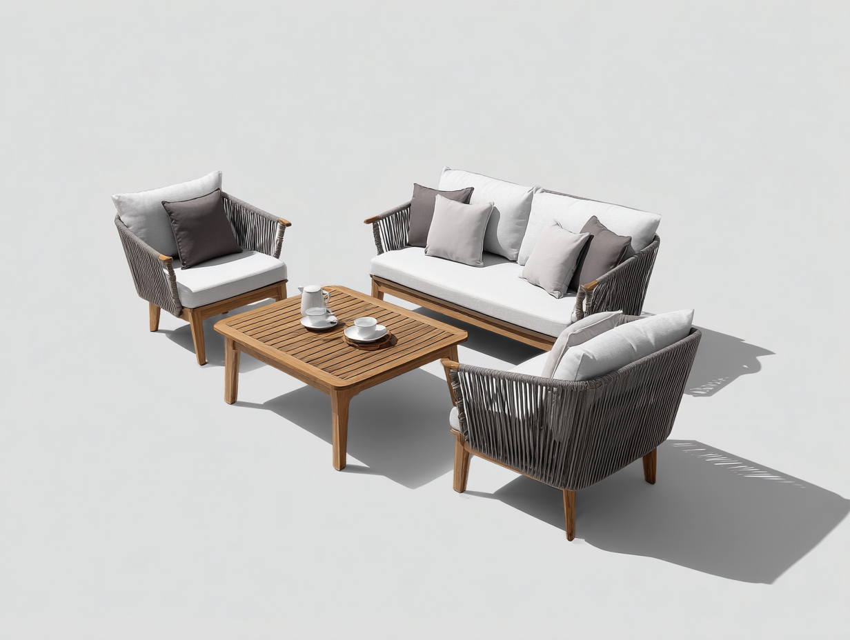 Association harmonieuse du bois et de la corde pour un style moderne. Assises larges et confortables. Table basse fonctionnelle pour un usage quotidien. Ensemble adapté aux terrasses, jardins et balcons.