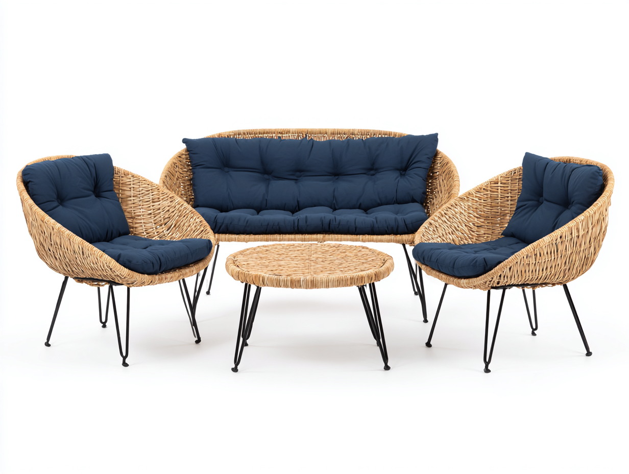 Structure en métal noir assurant stabilité et solidité. Revêtement en rotin tressé de couleur naturelle, associé à des assises rembourrées en textile bleu, adaptées à une utilisation extérieure. Finition soignée et durable.