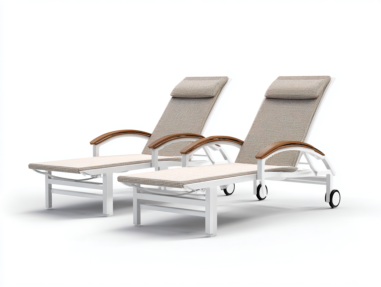 Structure en aluminium blanc résistante à la corrosion et légère. Revêtement en textile beige respirant avec appui-tête intégré pour un confort supérieur. Accoudoirs avec finition bois apportant une touche élégante et chaleureuse.